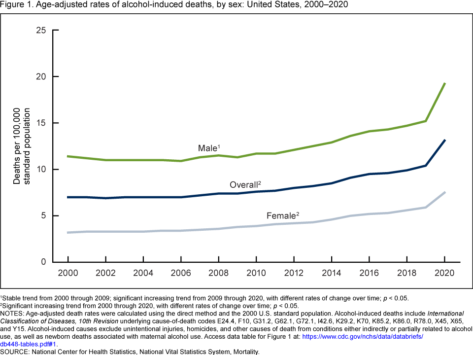 Rates of alcohol-induced deaths for males were stable from 2000 to 2009, increased 30% from 2009 (11.3) to 2018 (14.7), and increased 26% from 2019 (15.2) to 2020 (19.2).