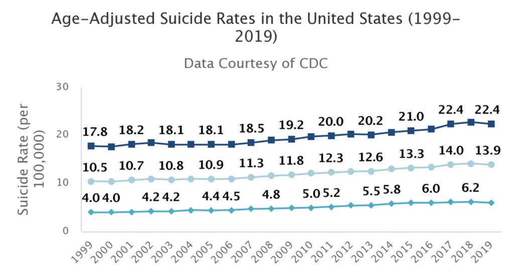 The suicide rate among males in 2022 was approximately four times higher than the rate among females.